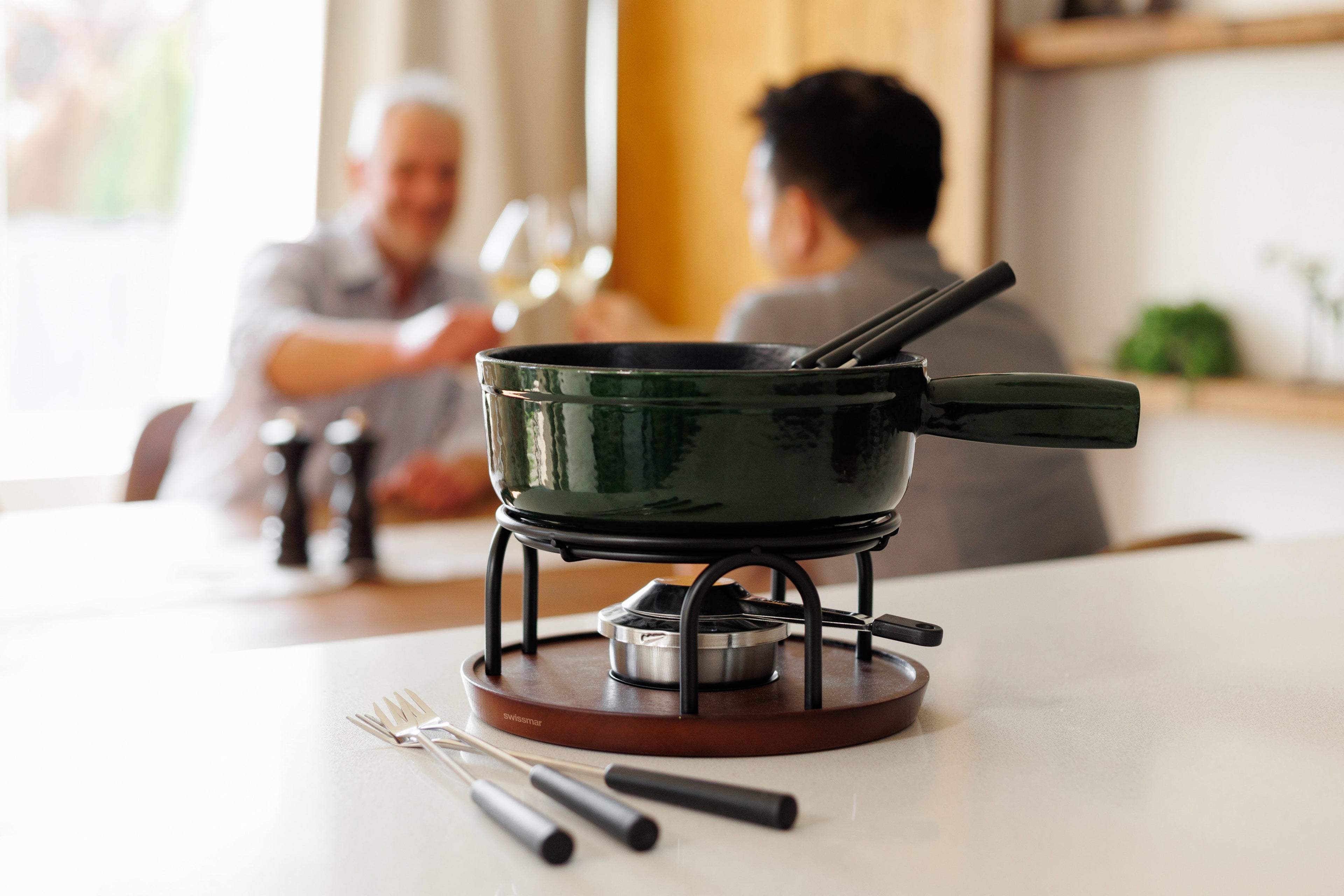 The Ticino 9-Piece Cast Iron Fondue Set is a durable and perfect for serving traditional cheese fondue at home. Featuring a classic Swiss caquelon-shaped cast iron fondue pot with an enameled interior, it provides even heat distribution and excellent retention—perfect for smooth, creamy blends like Gruyère and Emmental.