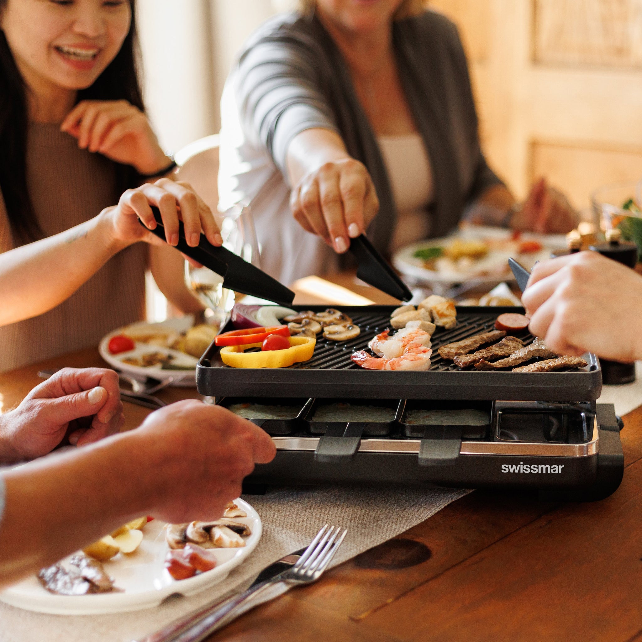 The Classic Raclette Party Grill is a fun and easy way to entertain family and friends at any time of day. Featuring a reversible cast iron grill plate with an enameled matte finish, this unit allows for grilling on one side and preparing crepes or pancakes on the other. Its anthracite enamel base complements the traditionally inspired design, blending function with style.